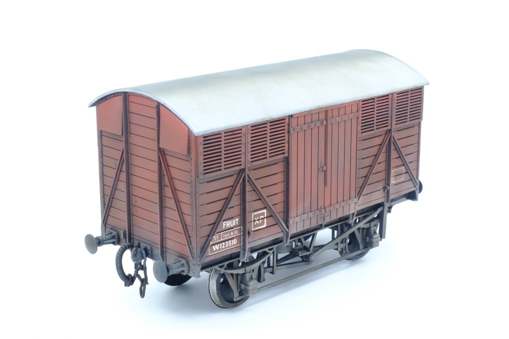 I chose the ‘Fruit Van’, a box car ventilated with large louvers and slots between the wood planks that sheathe the sides of the car, because it looked interesting and a little gnarly. Also, the name ‘Fruit Van’ seemed especially British. Per the instructions, these cars were principally intended to transport tomatoes and other produce to market—which apparently worked in cool, cloudy, Old Blighty, with its relatively short mainline routes. These cars were originally built in the 30s and ran well into the 60s and early 70s.